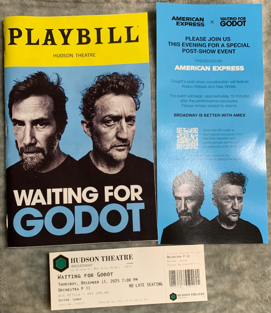 The play and entire cast were (yes, I’m going to say it) “Excellent!” But the experience was upgraded to “Outstanding!” when the audience was reminded that Alex and Keanu would be back out shortly to do a brief Talk Back session, so another first – didn’t know Talk Backs were a thing. Never happened at any London’s West End performance I attended. Then, on the way back to my cousin’s, it started to snow. Just flurries, no accumulation. I love watching snow fall… A magical end to a most excellent day.